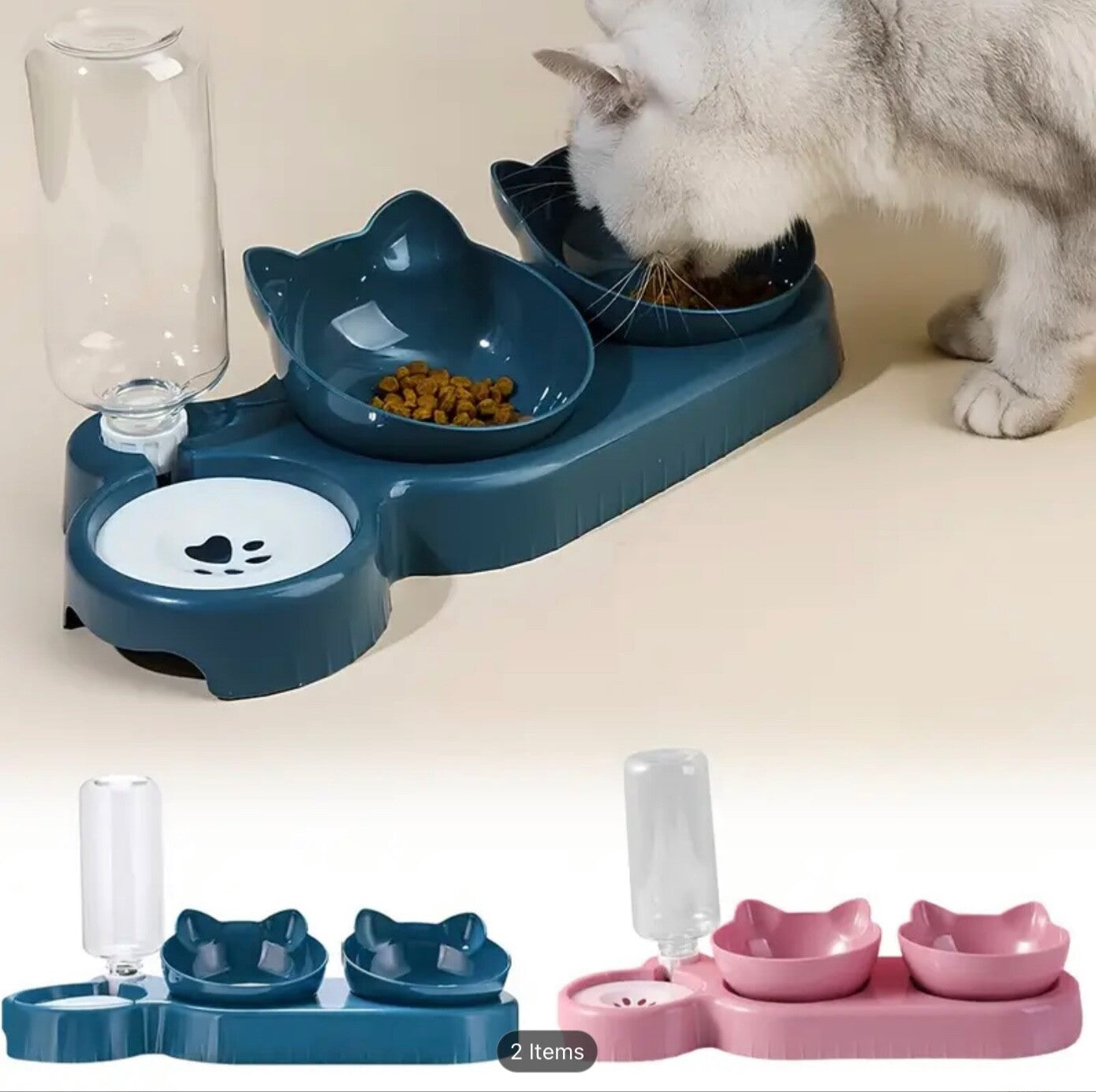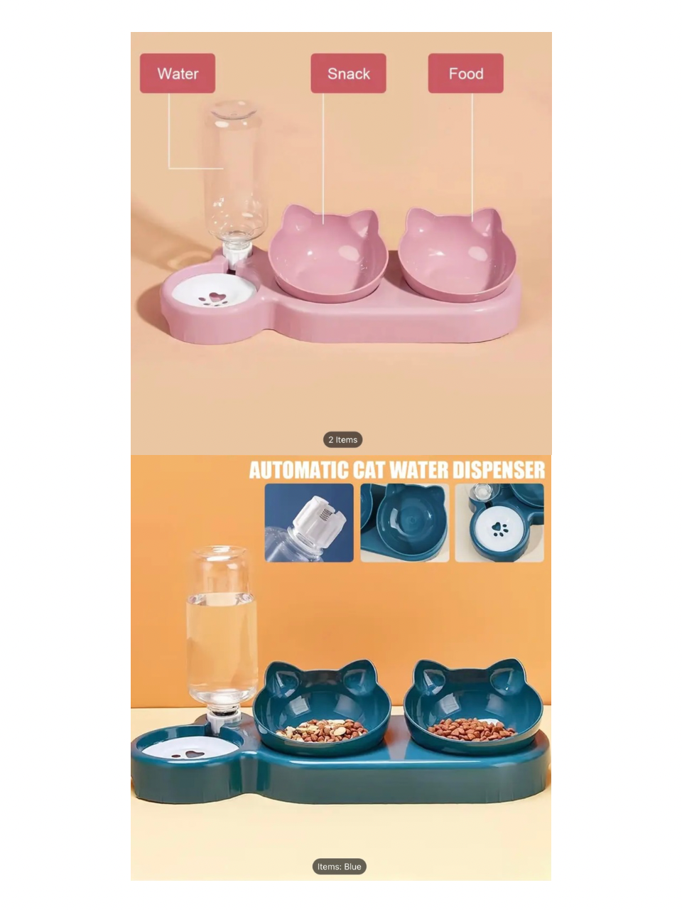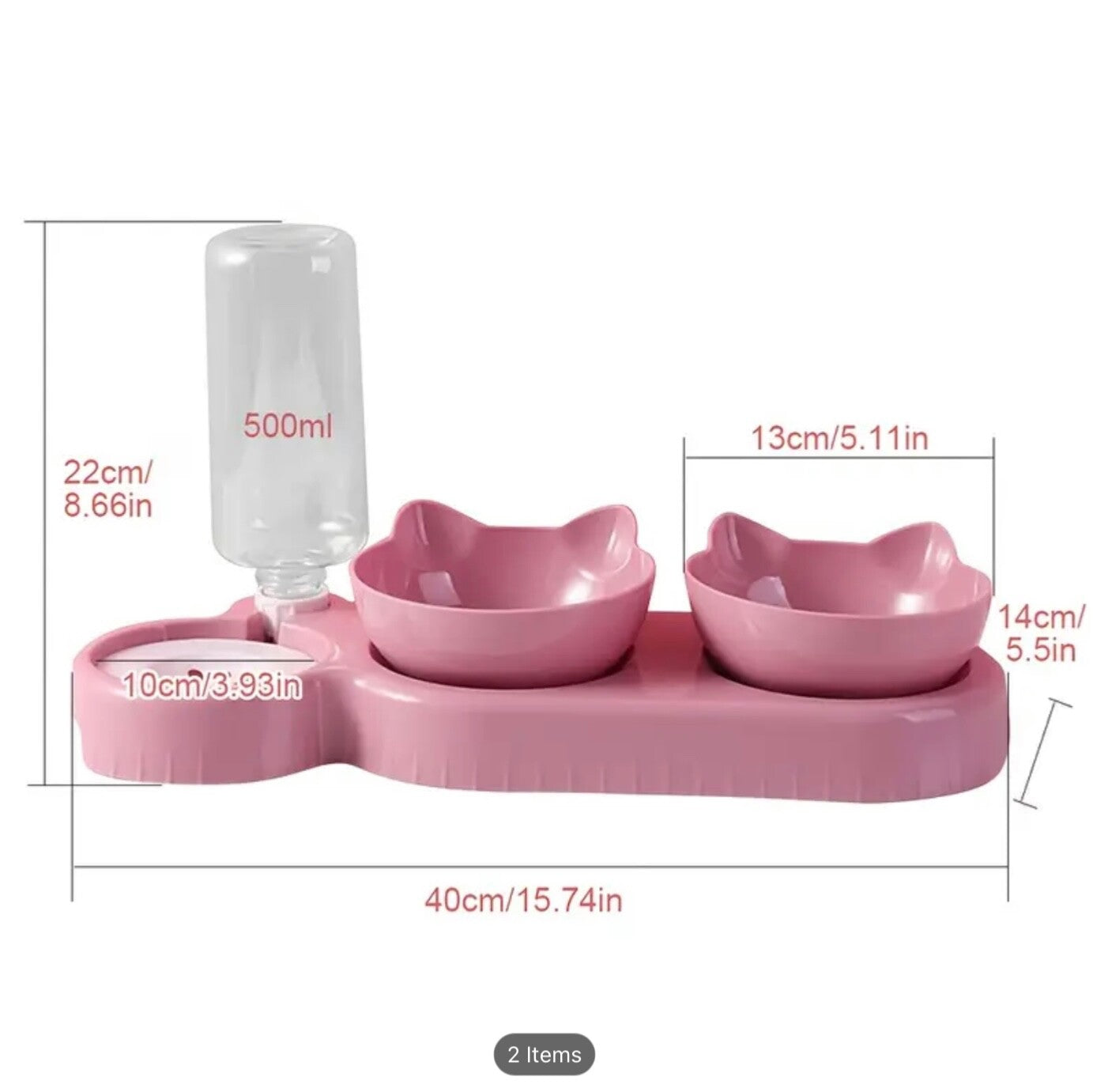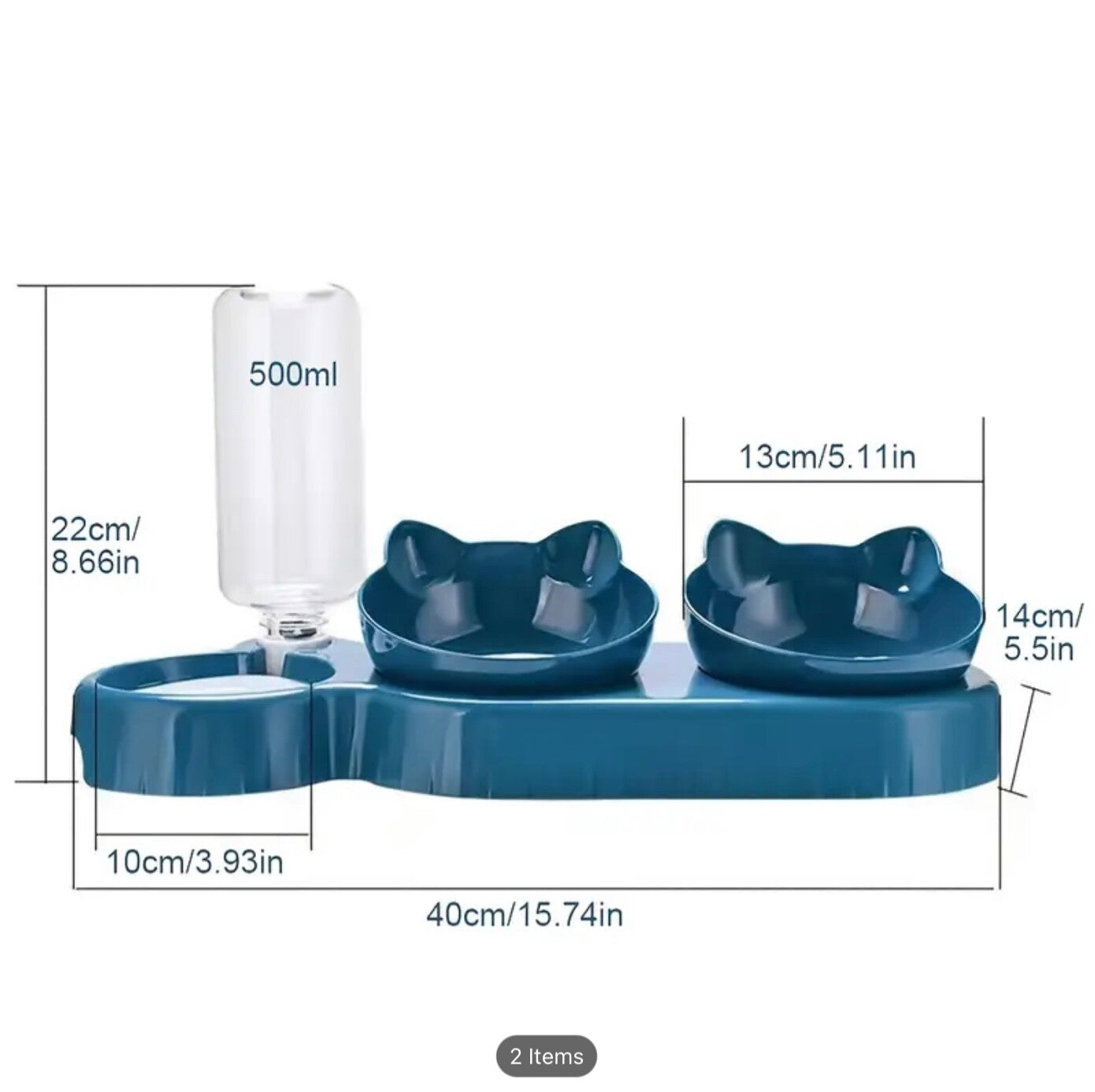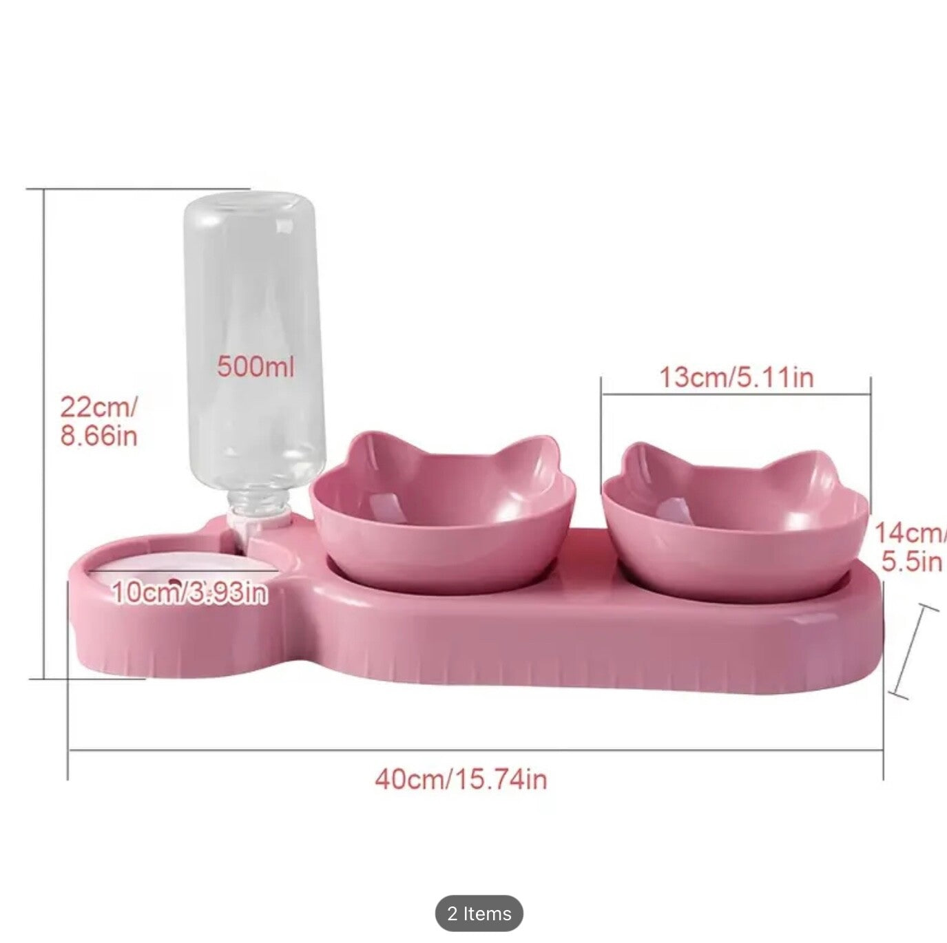 • Includes: 2 food bowls, 1 automatic water bottle, 1 raised stand