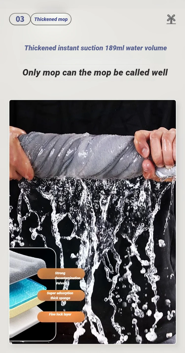3. 【Thickened instant suction cleaning cloth】, the mop can absorb 189ml of water instantly, upgraded composite fine fluff, no hair loss, strong water absorption, efficient cleaning without repetition, dry mopping dust, dust and hair without omission, wet mopping stains, water stains, oil stains without leaving any traces,