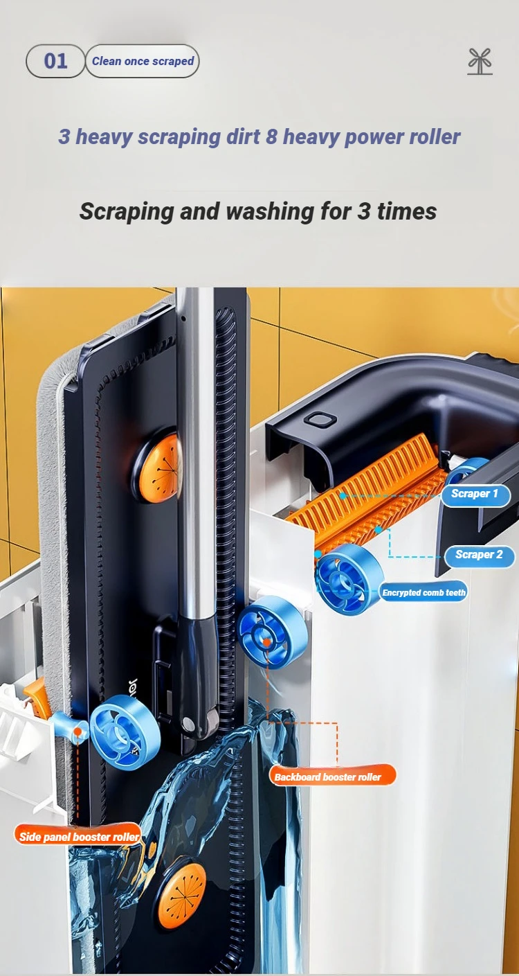 2.【Upgraded scraping and washing system】, thickened and durable PP material, four times cleaner, and added 3-layer scraping + 8-layer power-assisted rollers. Scraping and washing once is equivalent to three times, Comes with comb teeth,No need to manually remove hair impurities,making the mop as good as new