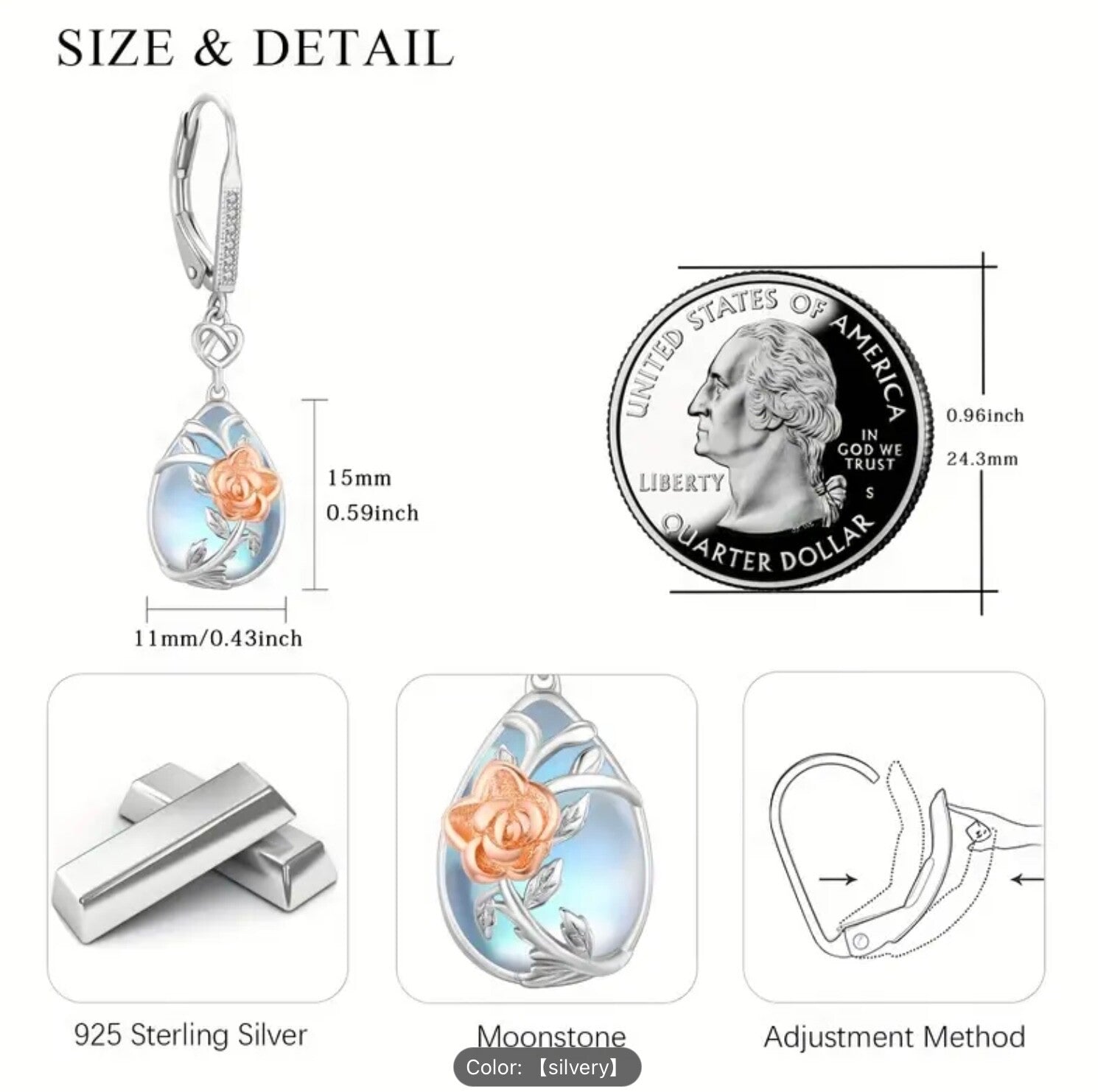 • Gemstone: Genuine Moonstone cabochon (natural adularescence)