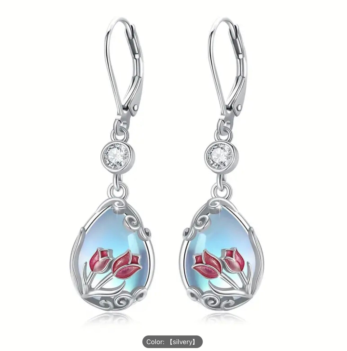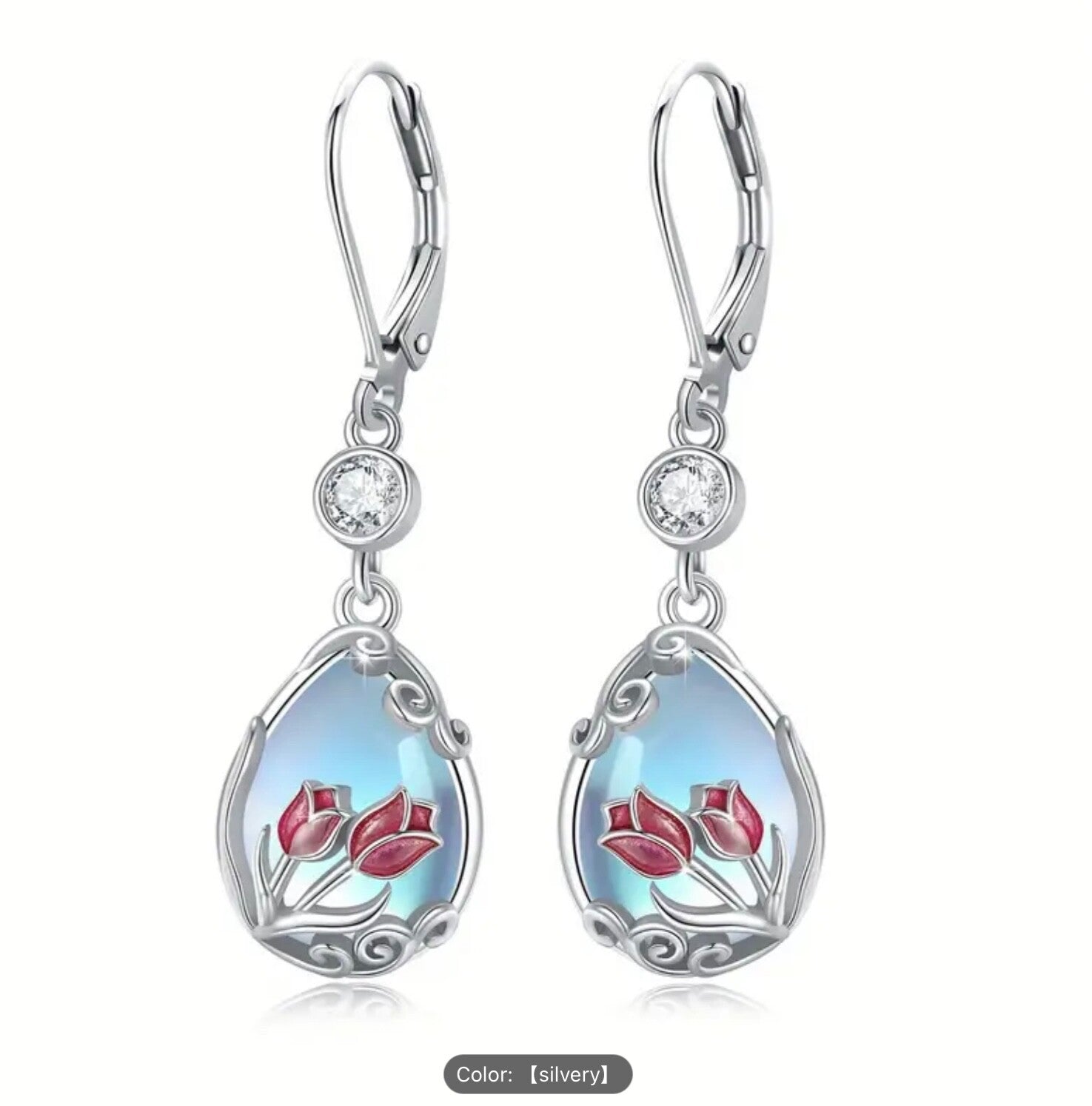 925 Silver Tulip Moonstone Teardrop CZ Dangle Earrings–Hypoallergenic Ideal Gift