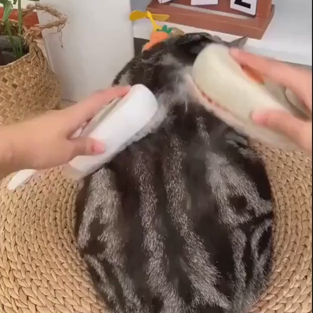 The massager includes a water spray beauty brush for cat care. It's an essential grooming tool for pet owners. The design focuses on functionality and ease of use, making it a valuable addition to any pet grooming kit.