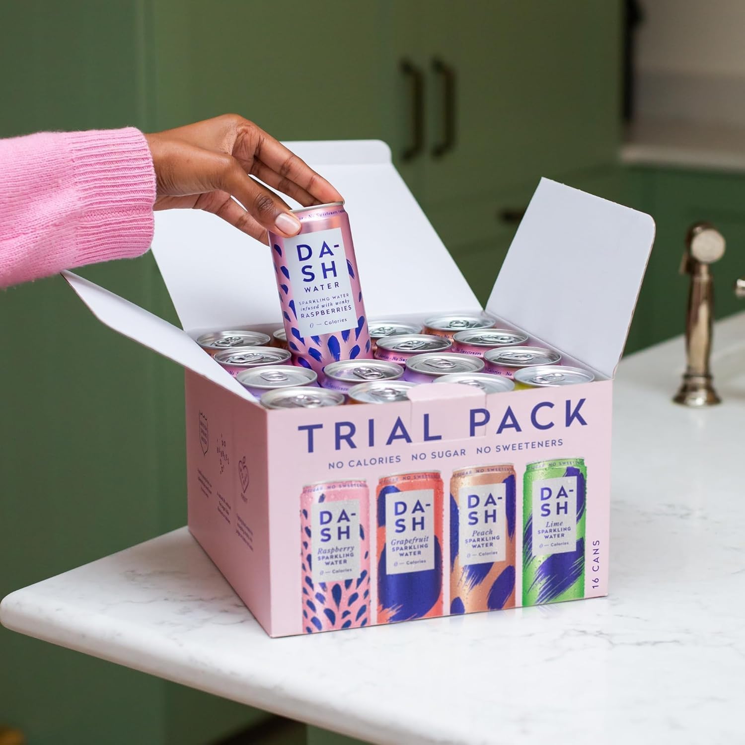 DASH Water Mixed Pack X 16 – Flavoured Sparkling Spring Water – Raspberry, Lime, Grapefruit, Peach – Infused with Wonky Fruit (16 X 330Ml Cans) Dash