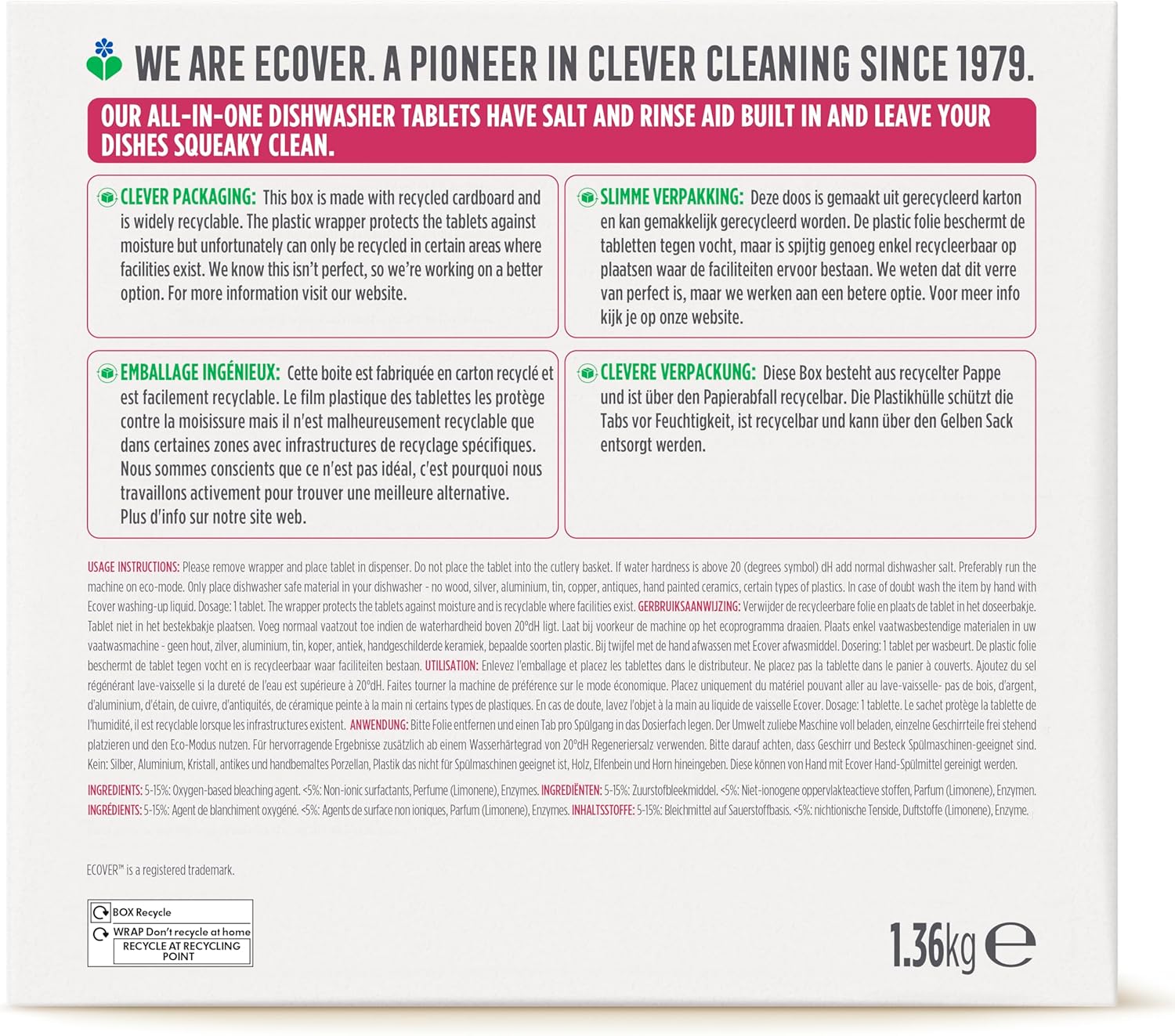 Ecover All in One Dishwasher Tablets, Contains Salt & Rinse Aid, Powerful Cleaning, Fresh Lemon & Mandarin Scent, Pack of 1, 68 Tablets