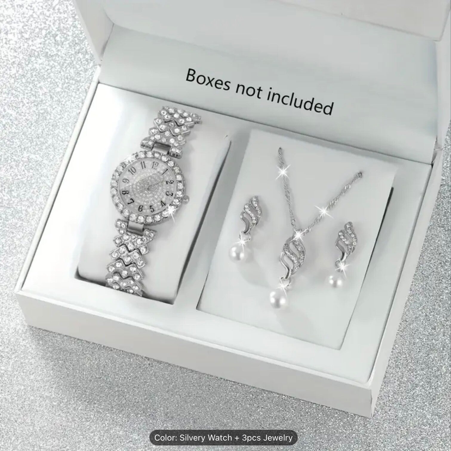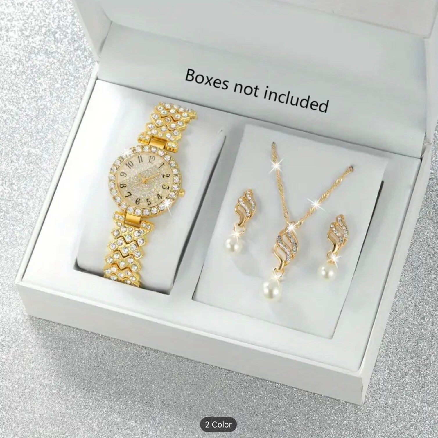 Glamorous Women’s Girls Quartz Watch & 3pc Jewellery Set – Elegant Fashion Gift