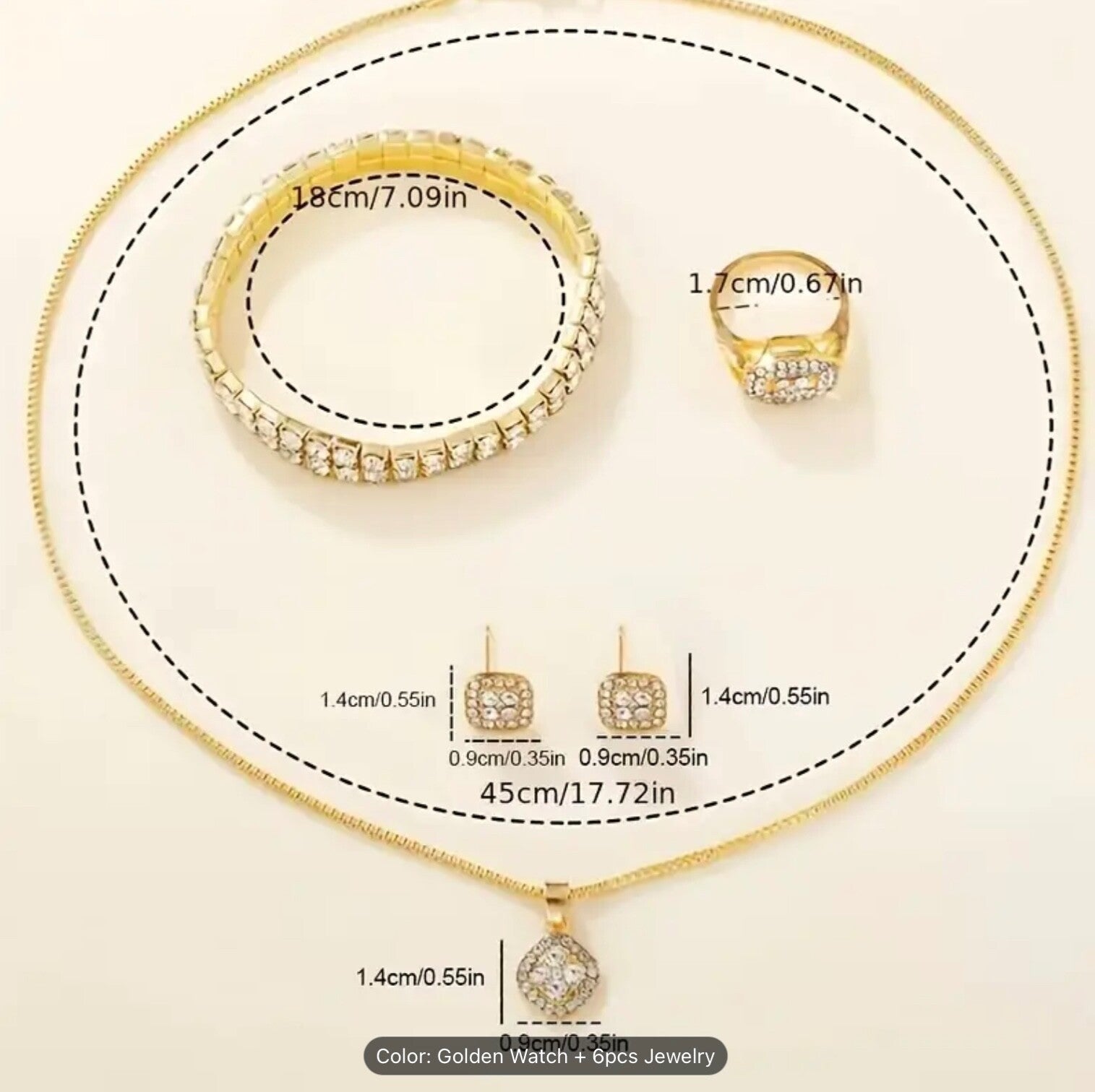 Elevate your style with this stunning 6-piece Luxury Women's Watch & Jewelry Set —a perfect gift for Mom, girlfriend, or yourself. Pair it with your favorite outfits for brunch dates, work meetings, or evening events.