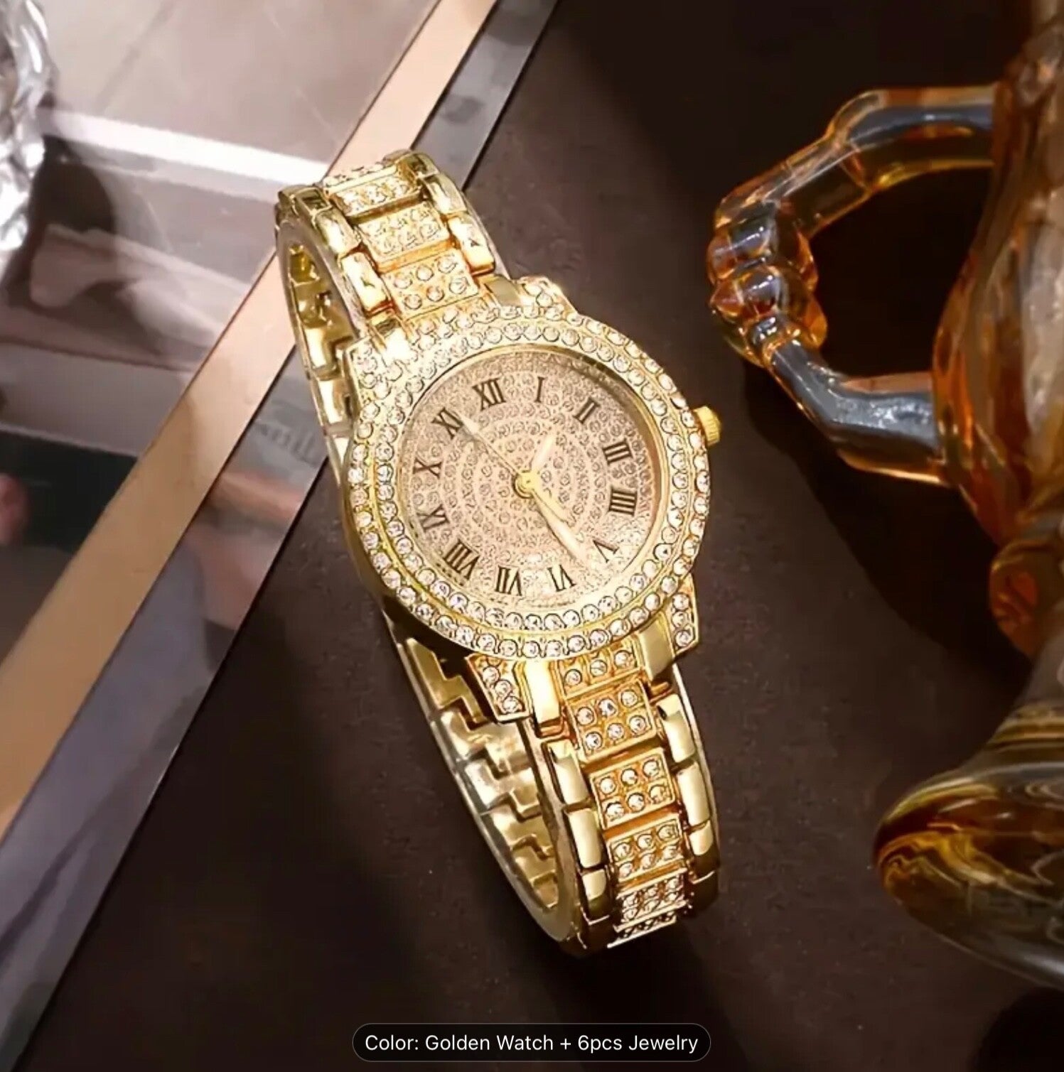 Luxury Women Girls 6pcs Watch- Bracelet & Jewellery Set – Rhinestone Quartz Gift