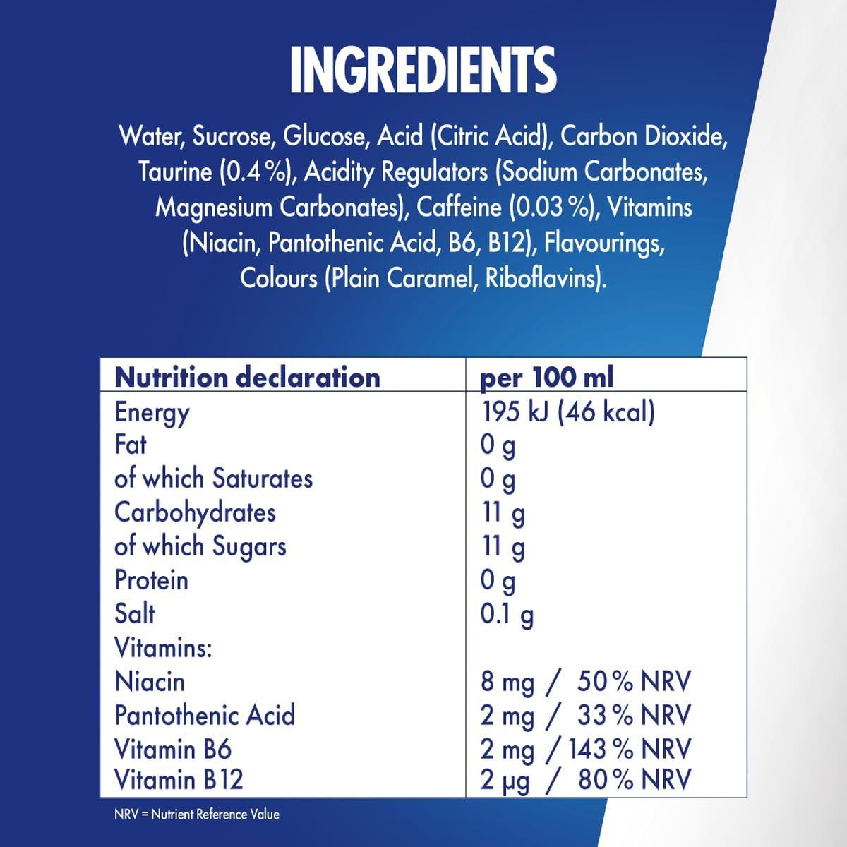 Water, Sucrose, Glucose, Acid (Citric Acid), Carbon Dioxide, Taurine (0.4 Percent), Acidity Regulators (Sodium Carbonates, Magnesium Carbonates), Caffeine (0.03 Percent), Vitamins (Niacin, Pantothenic Acid, B6, B12), Flavourings, Colours (Plain Caramel, Riboflavins).