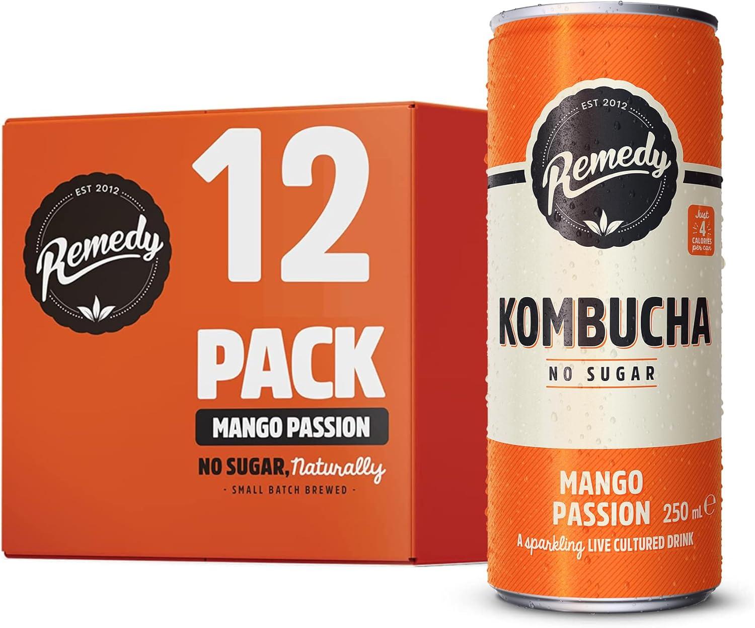 Remedy Kombucha Mango Passion Sparkling Live Cultured Soft Drink 12 x 250ml No Sugar Probiotic for Gut Health Natural Fruity Taste