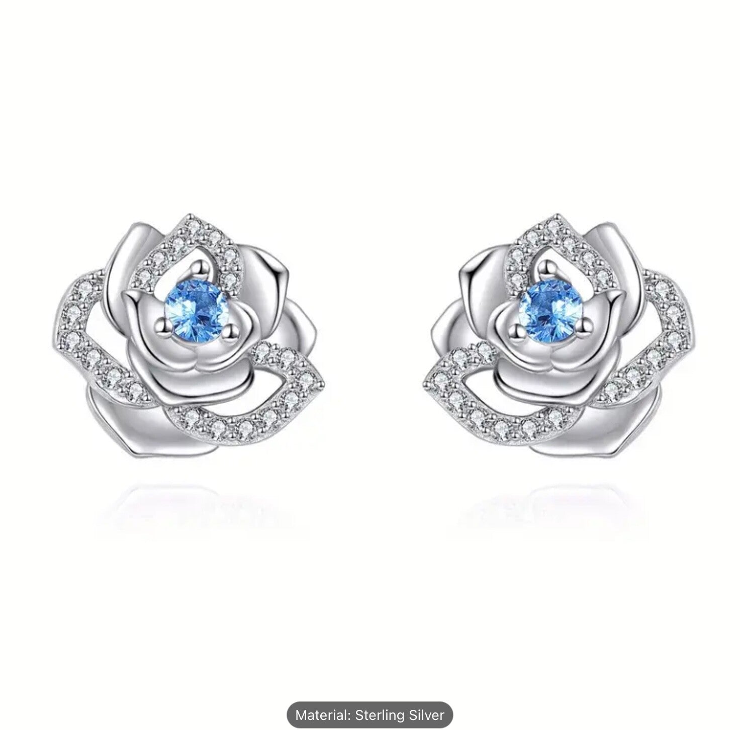 Sterling Silver Rose Earrings Stud Cubic Zirconia Women Romantic Gift Jewellery