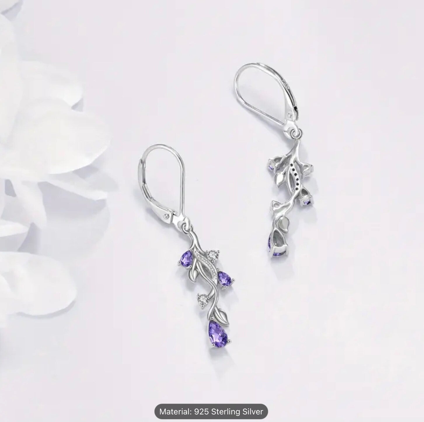 Sterling Silver Tulip Flower Teardrop Earrings Purple Cubic Zirconia Dangle Gift