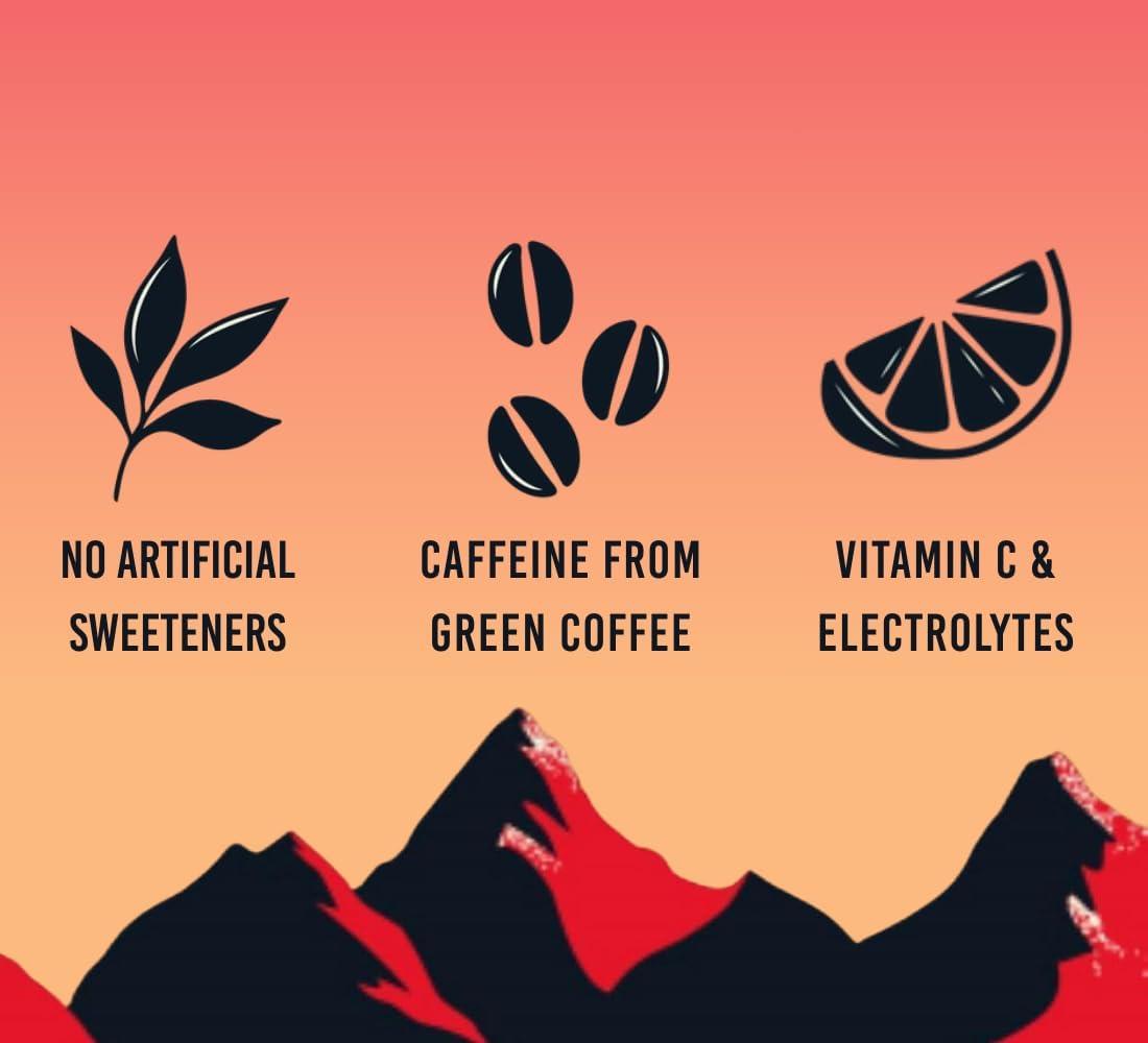 - Ingredients: Sparkling water, beet sugar, fruit sugar, lemon juice, pineapple juice, passionfruit juice, herbal extracts, caffeine, green coffee, green tea, natural flavourings, electrolytes from Himalayan rock salt.